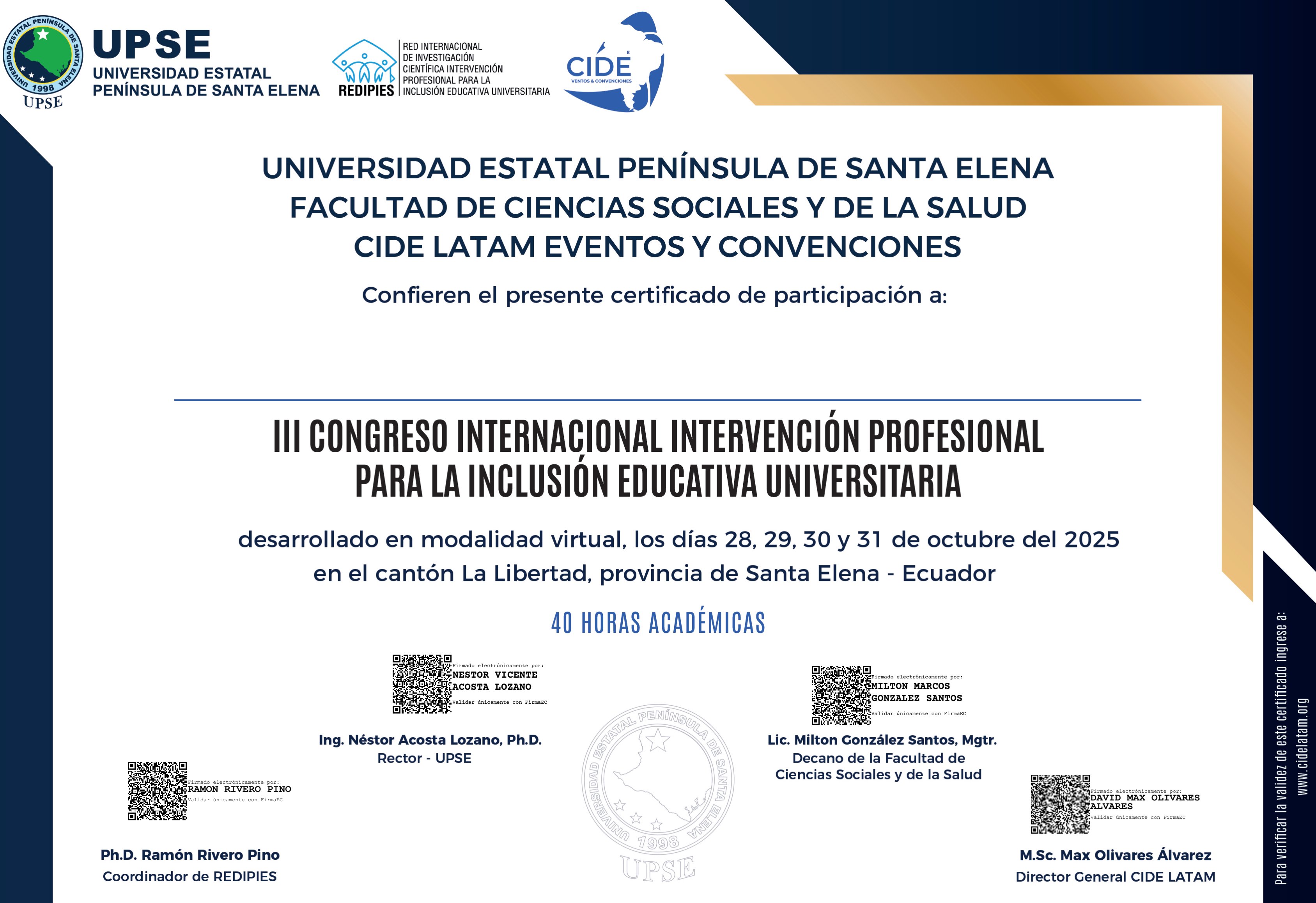 Cert-Redipies-2025 {{attendee_name}} Código de Verificación:{{ticket_id}} Compartir: Bryan Steeven Tello Cedeño Publicación anterior Cert-Salud-2025 PRUEBA 21/11/2025 Siguiente publicación BIO-2026-TICK1 08/12/2025 También te puede interesar ¿Te gustaría ampliar tus conocimientos en la Metodología Cuantitativa?… 5 octubre, 2022 *REVISTA REPSI- ÁREA PSICOLOGÍA*… 5 octubre, 2022 Capacitate como Tutor de Trabajo de Pre y Posgrado…. 4 octubre, 2022